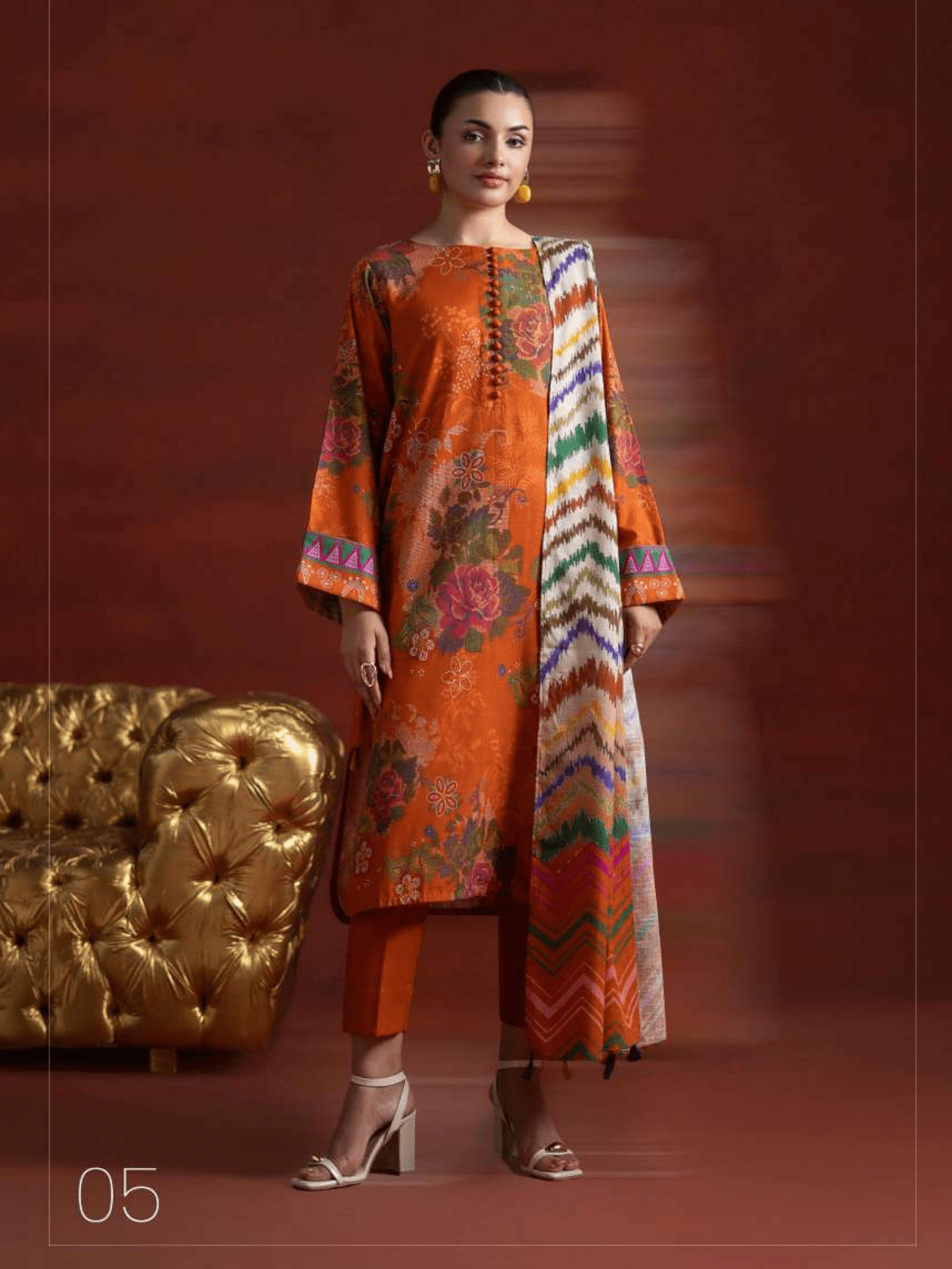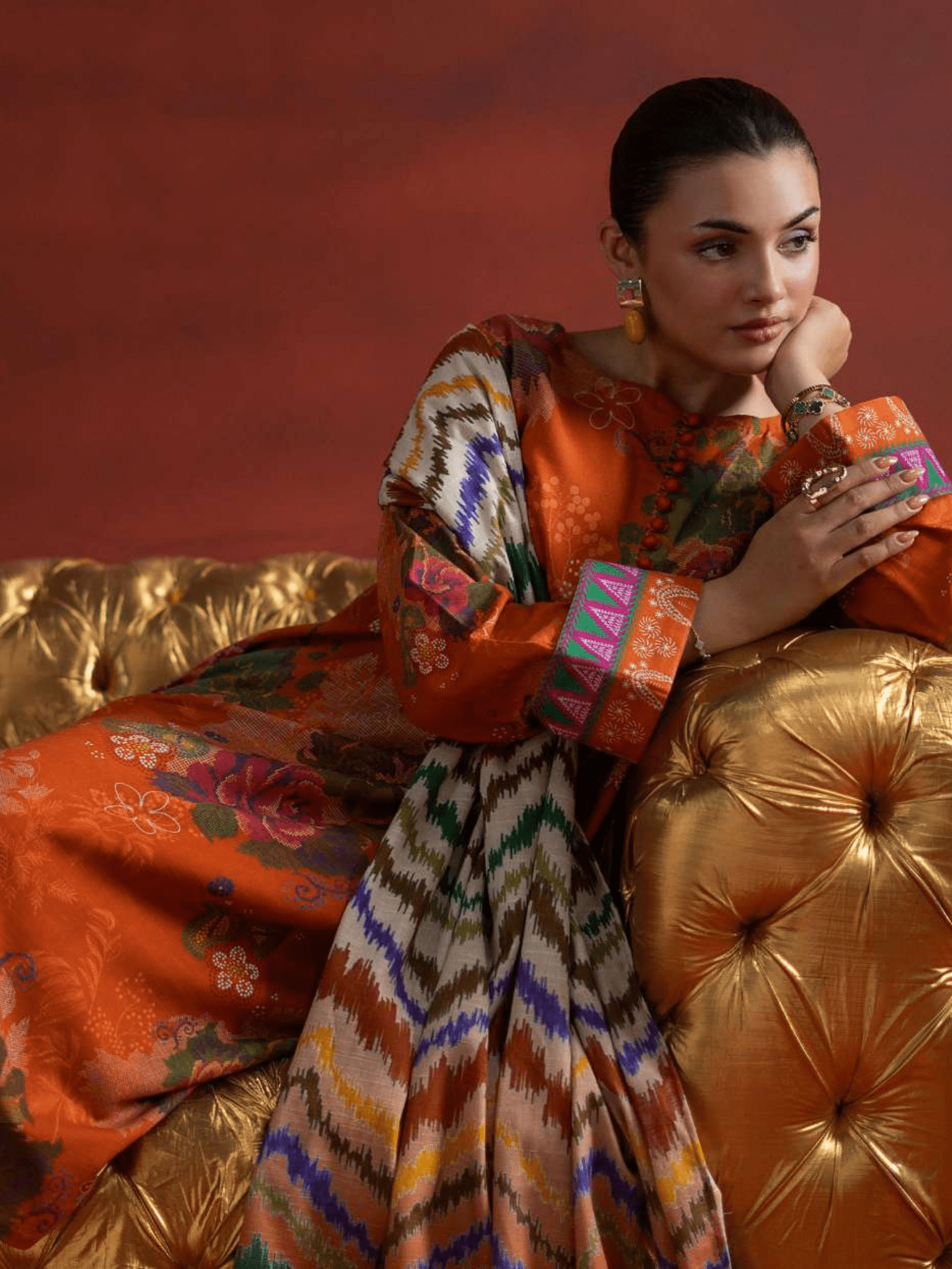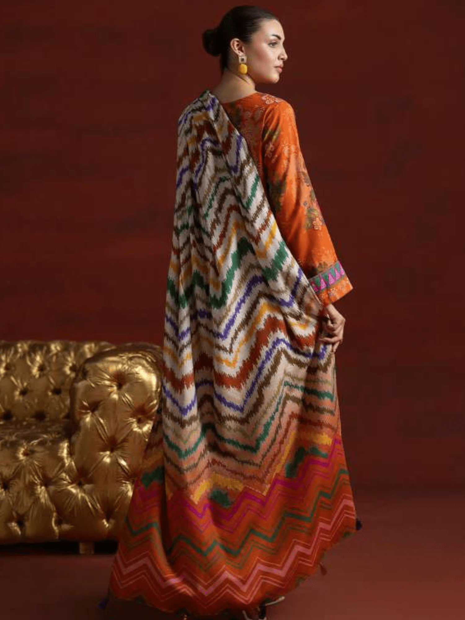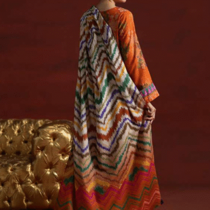 Unstitched 3-piece digital printed khaddar suit for women with a dyed trouser and printed dupatta. Premium winter fabric, stylish and comfortable.