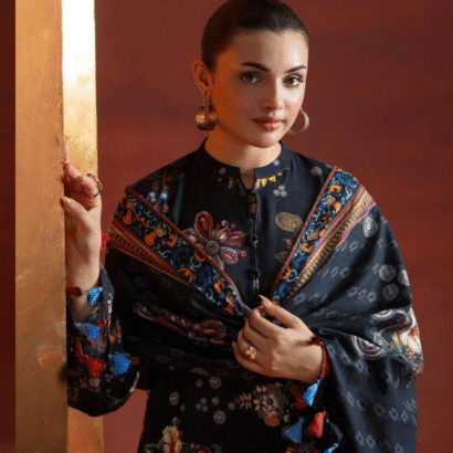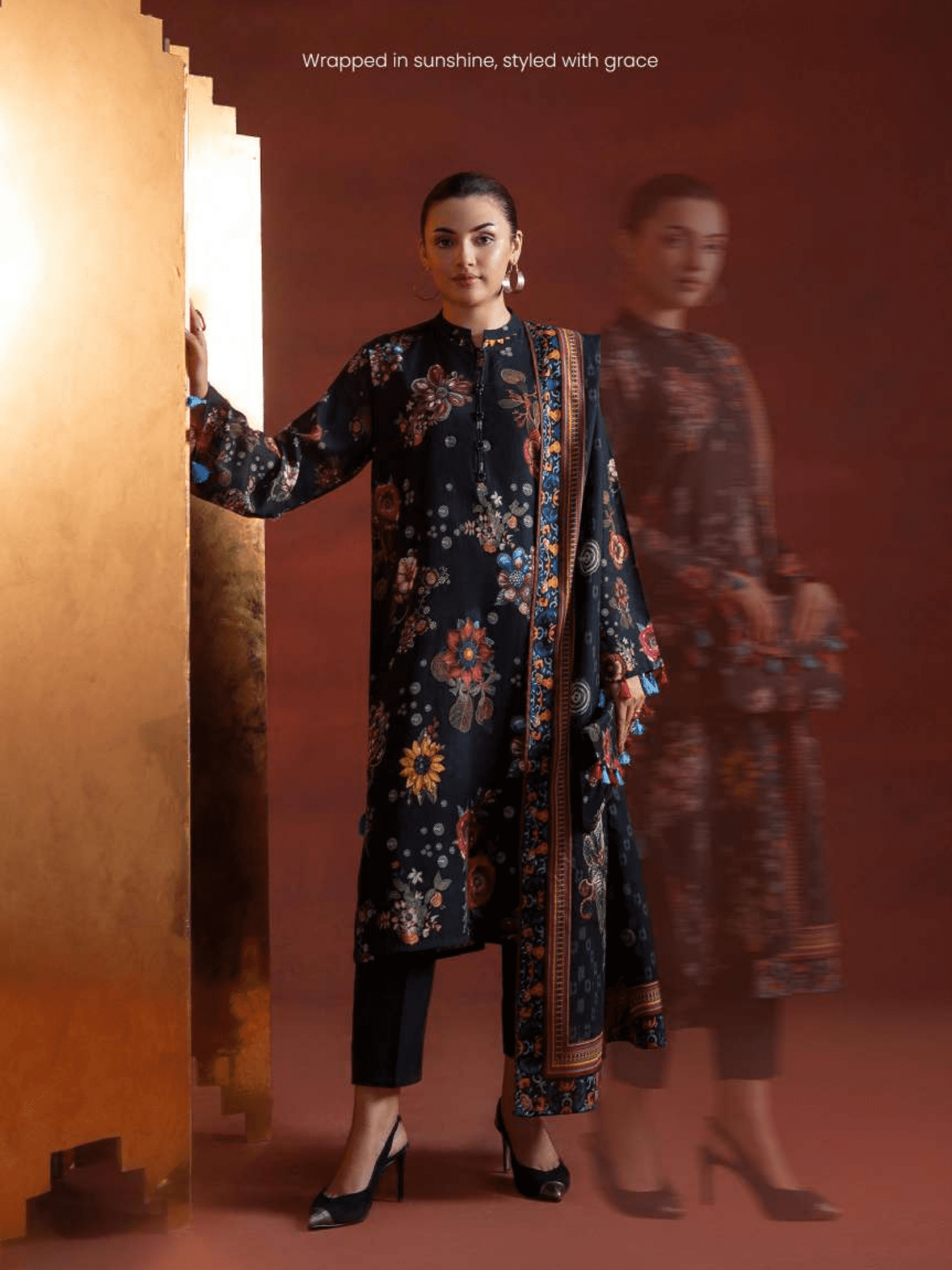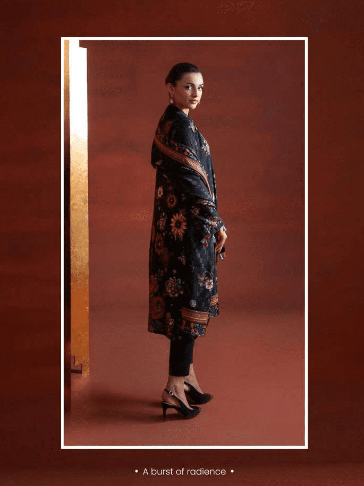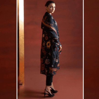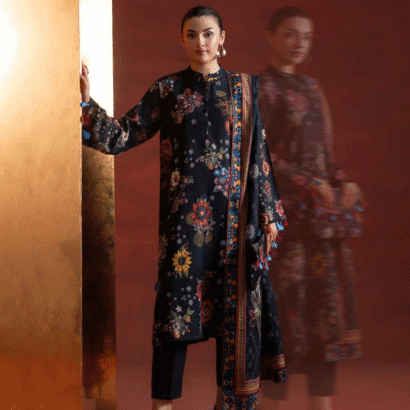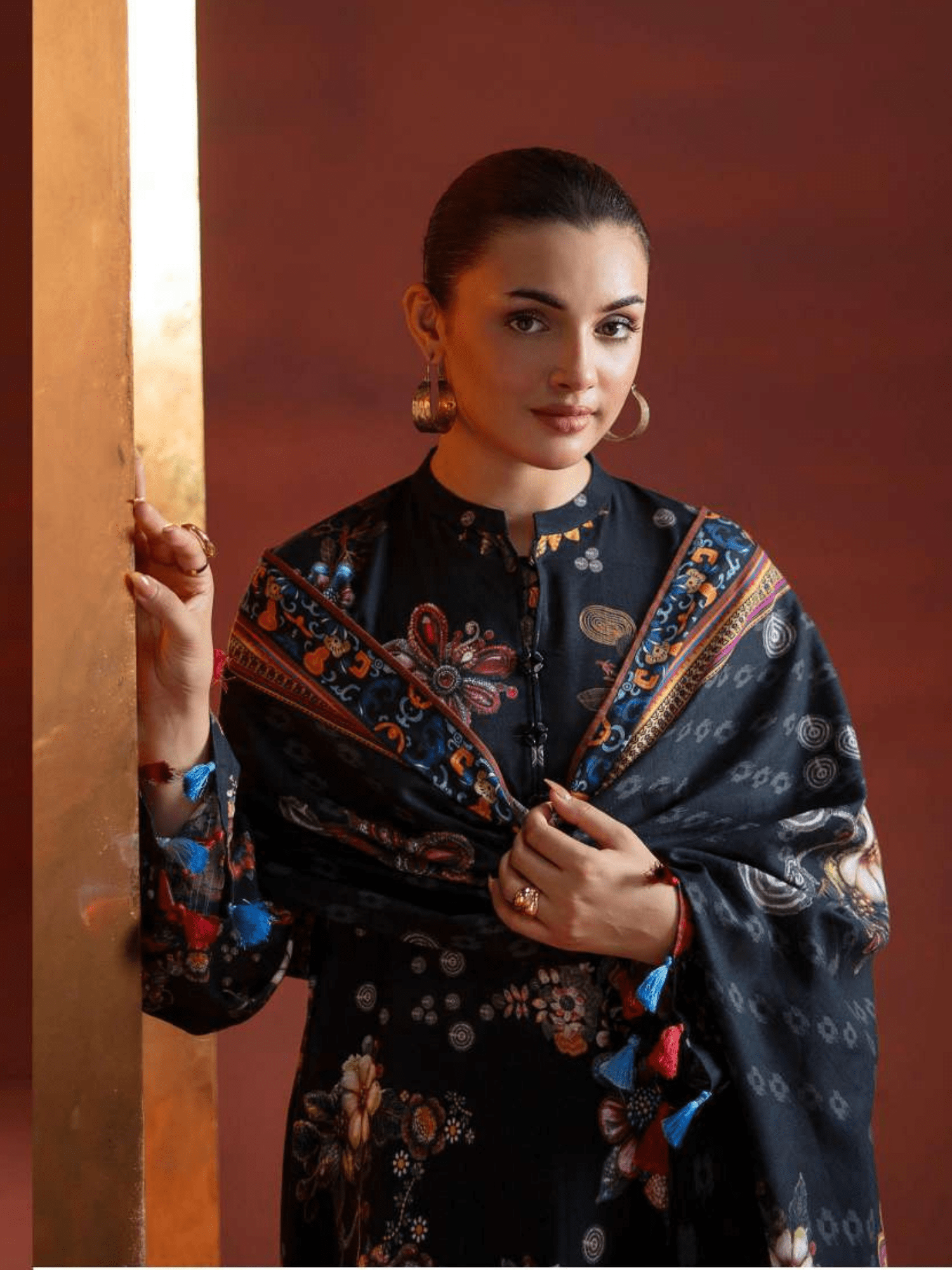 Unstitched 3-piece digital printed khaddar suit for women with a dyed trouser and printed dupatta. Premium winter fabric, stylish and comfortable.